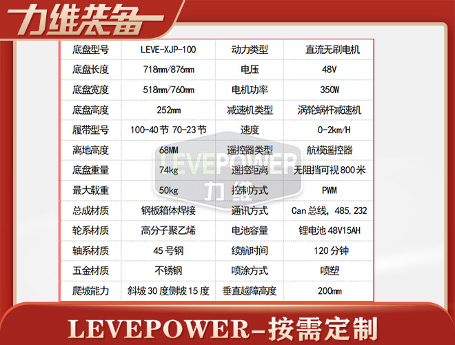 履帶式擺臂機(jī)器人底盤(pán)長(zhǎng)876mm,底盤(pán)寬760mm,底盤(pán)高252mm,履帶車自重74KG,載重50KG,箱體采用鋼板焊接而成,無(wú)線遙控履帶擺臂機(jī)器人搭載48v350W直流永磁無(wú)刷電機(jī),渦輪蝸桿減速機(jī)增大動(dòng)力,履帶底盤(pán)轉(zhuǎn)彎動(dòng)力更強(qiáng),爬坡更有勁。加上合理的擺臂設(shè)計(jì),爬樓越障性能強(qiáng),遙控車搭配48V20AH鋰電池續(xù)航時(shí)間更長(zhǎng)。