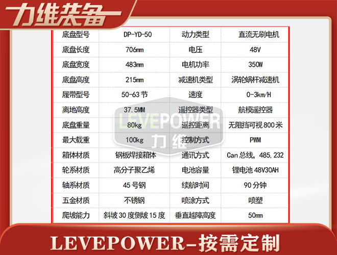 橡膠履帶底盤長706mm,橡膠履帶底盤寬483mm,橡膠履帶底盤高215mm,無線航模遙控履帶底盤采用48v350W直流無刷永磁電機(jī),渦輪蝸桿減速機(jī)動力更強(qiáng),轉(zhuǎn)彎靈活,操控簡單。履帶底盤電池采用48V30AH鋰電池續(xù)航時(shí)間更長。履帶底盤箱體采用鋼板焊接而成,輪系采用高分子聚乙烯,履帶底盤整體重量輕,耐磨性強(qiáng)。